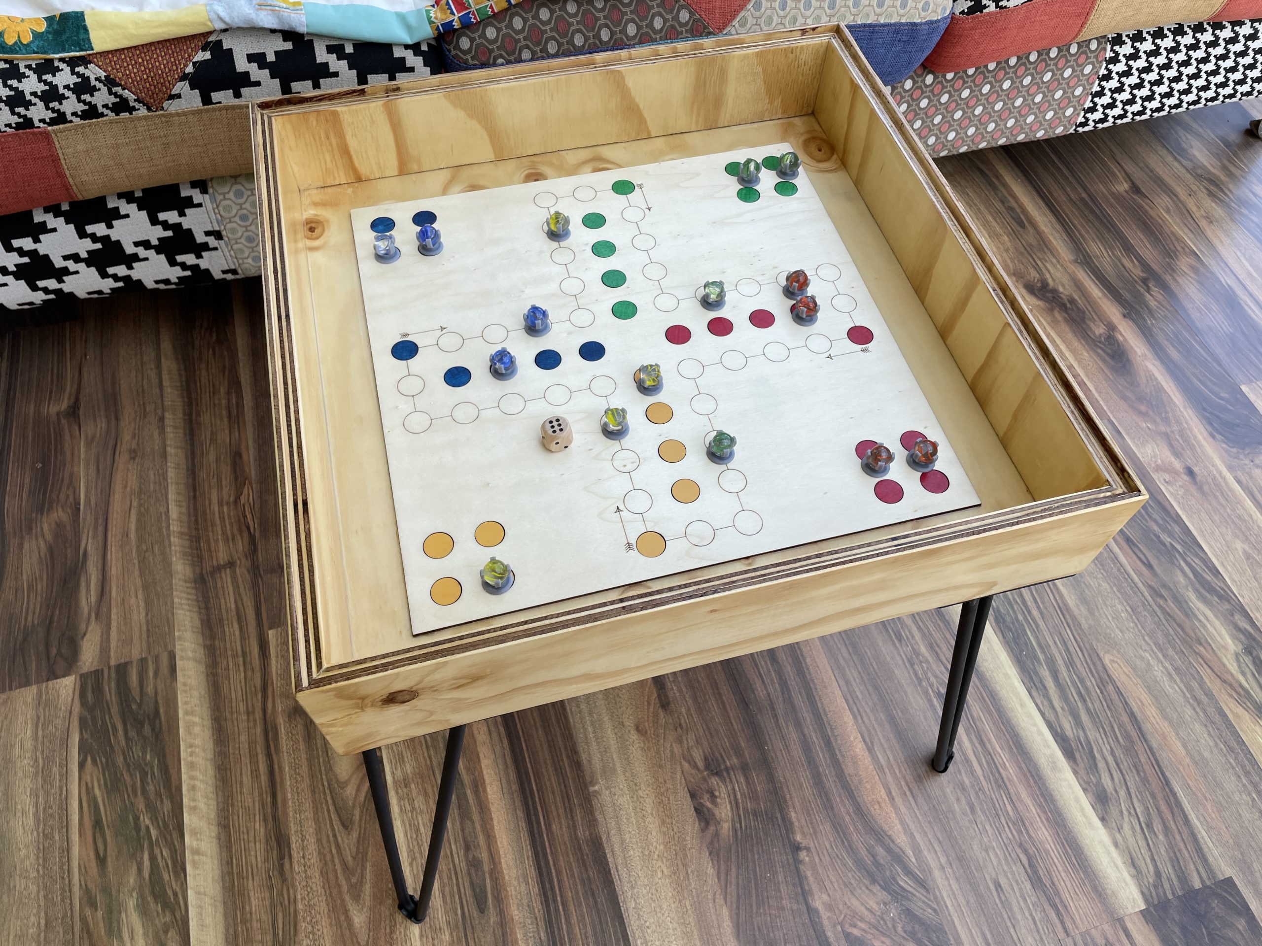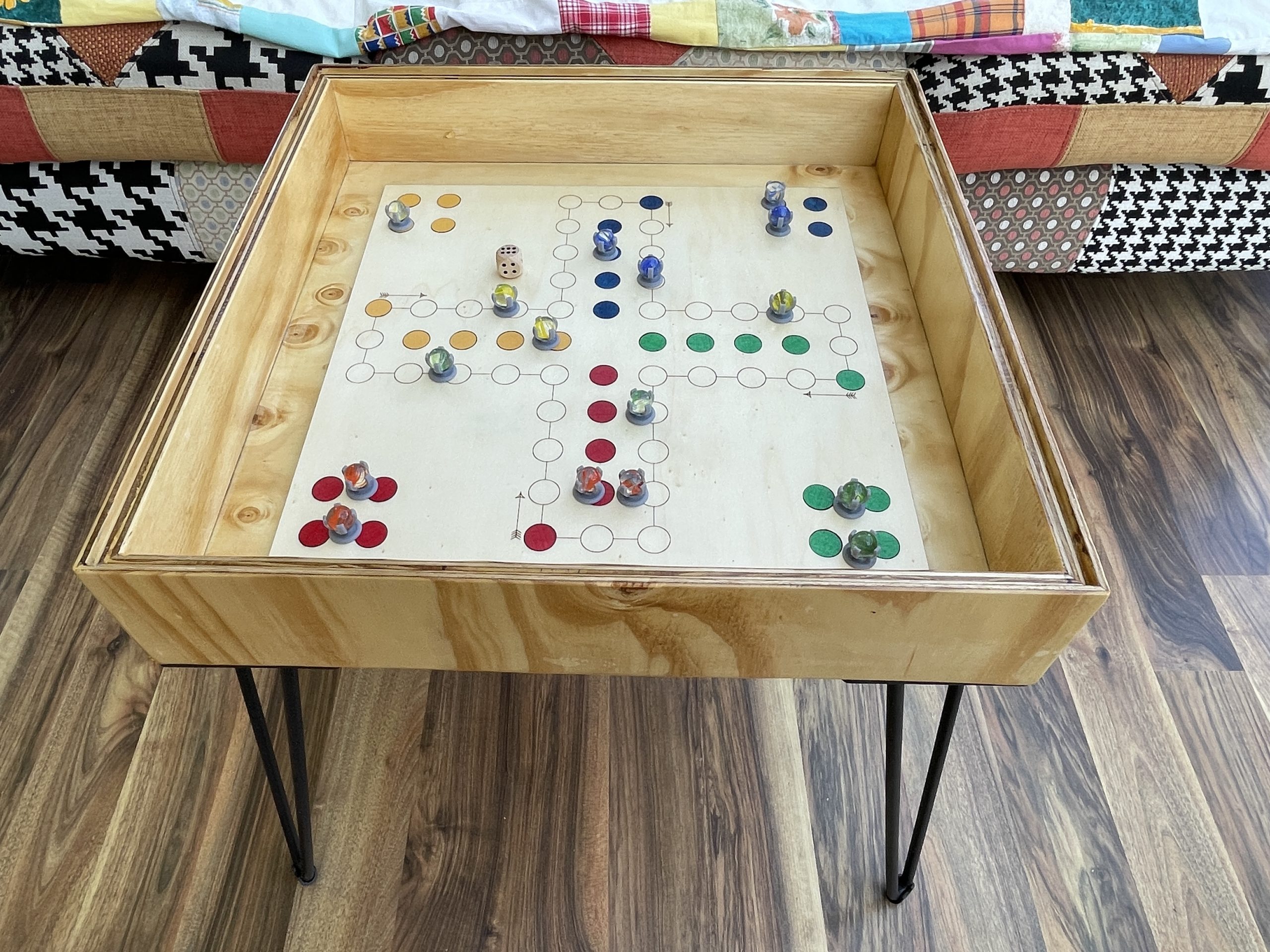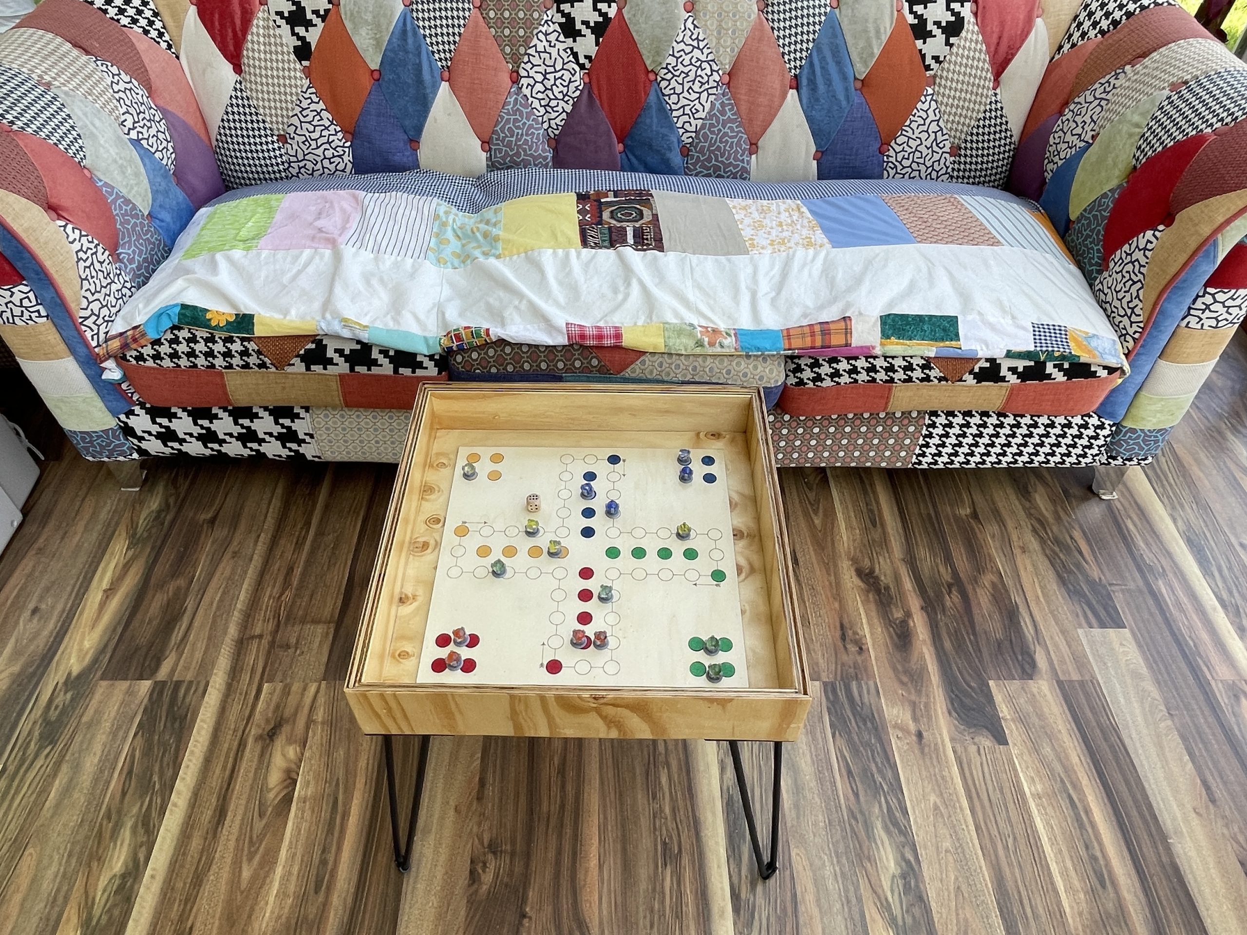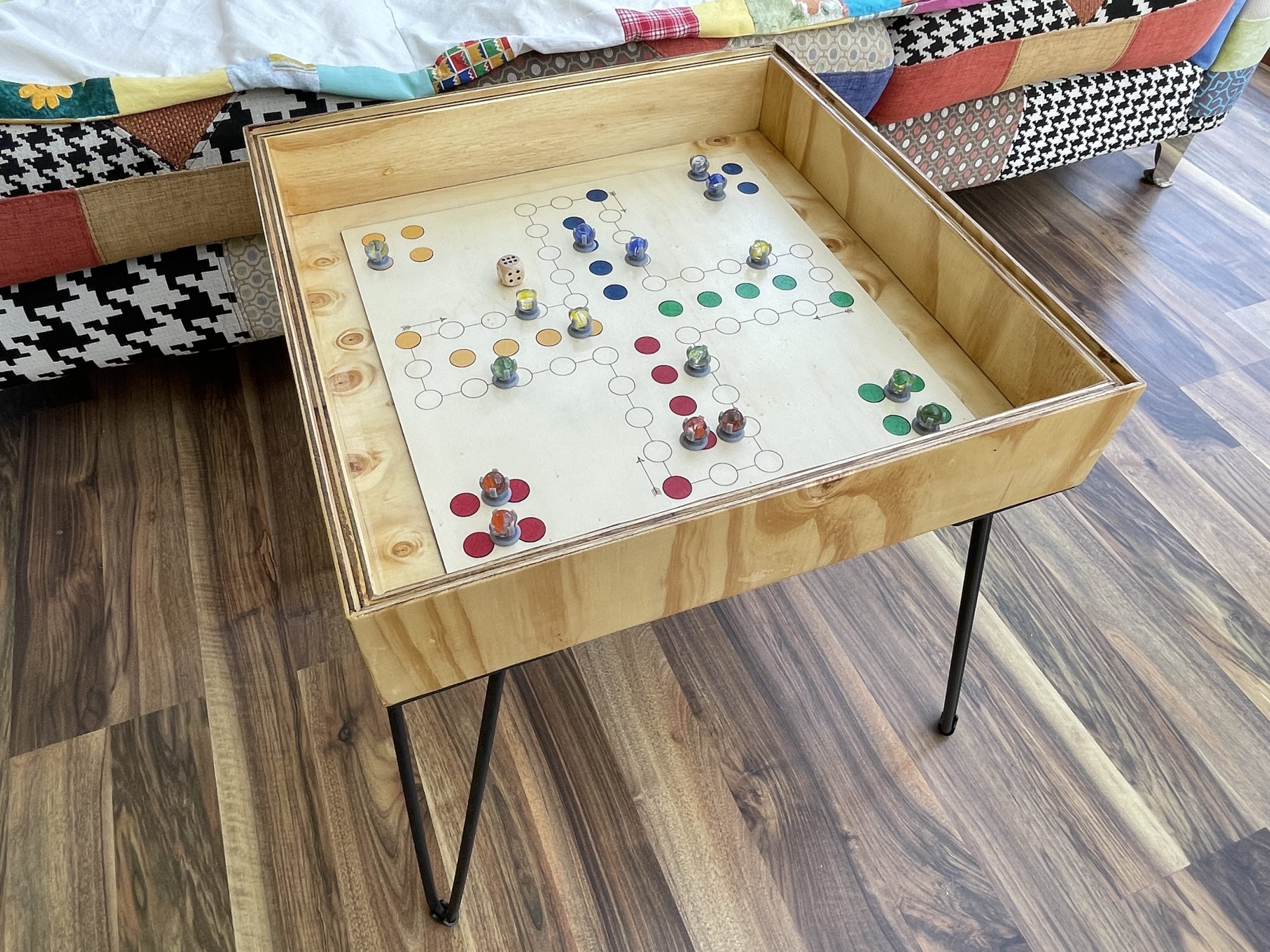 Ta unikatna klubska mizica združuje tradicionalno družabno igro Človek ne jezi se in sodoben dizajn, zaradi česar je popolna za sproščene trenutke s prijatelji in družino. Narejena je iz vezane plošče, pleksi stekla in ima elegantne kovinske noge. Priložene so unikatne ročno izdelne figurice.