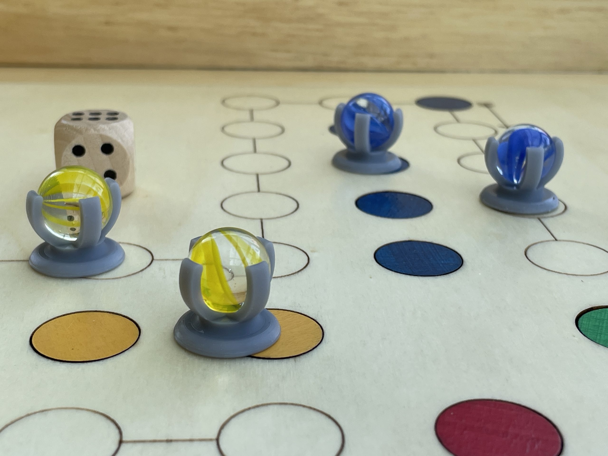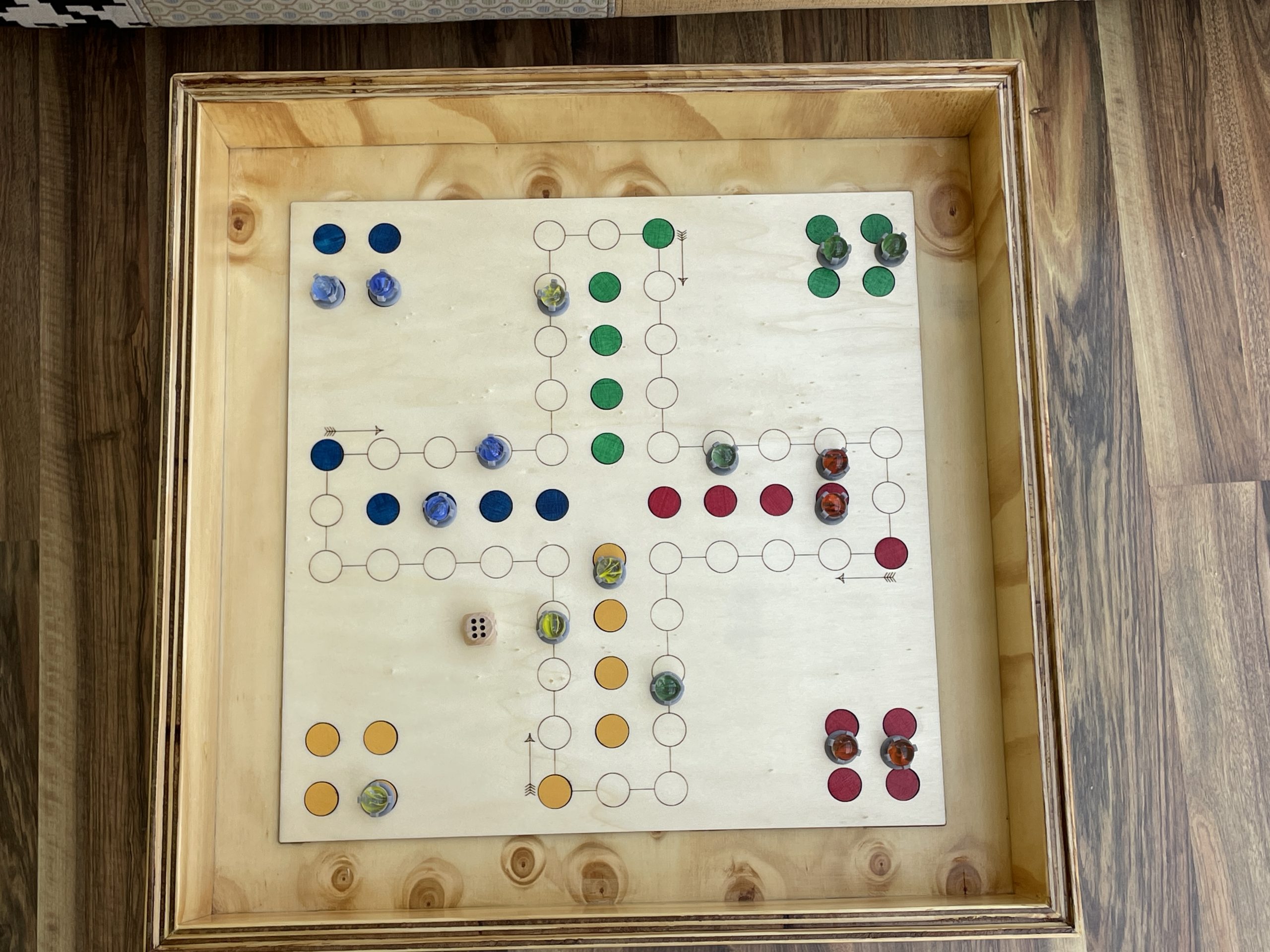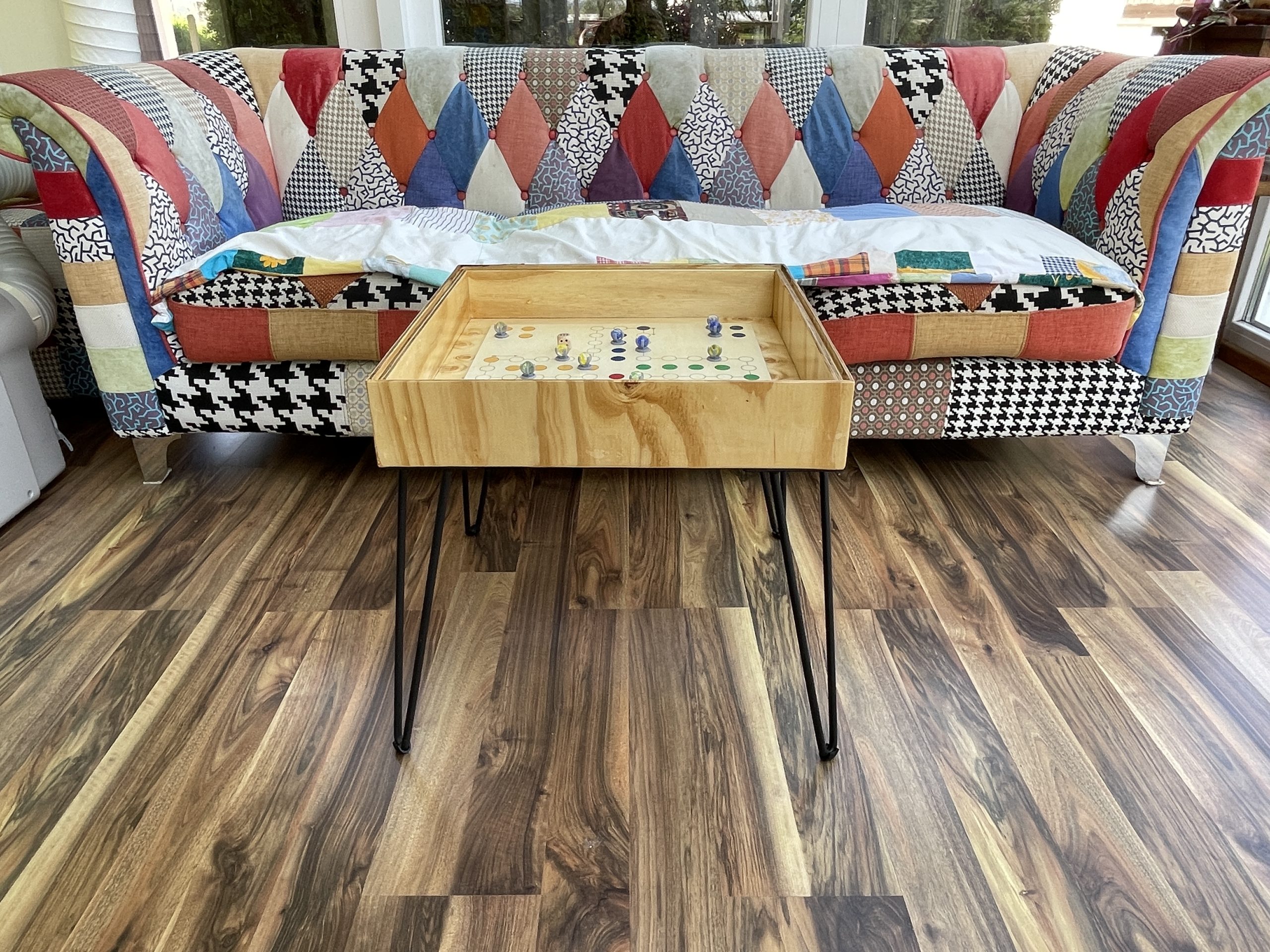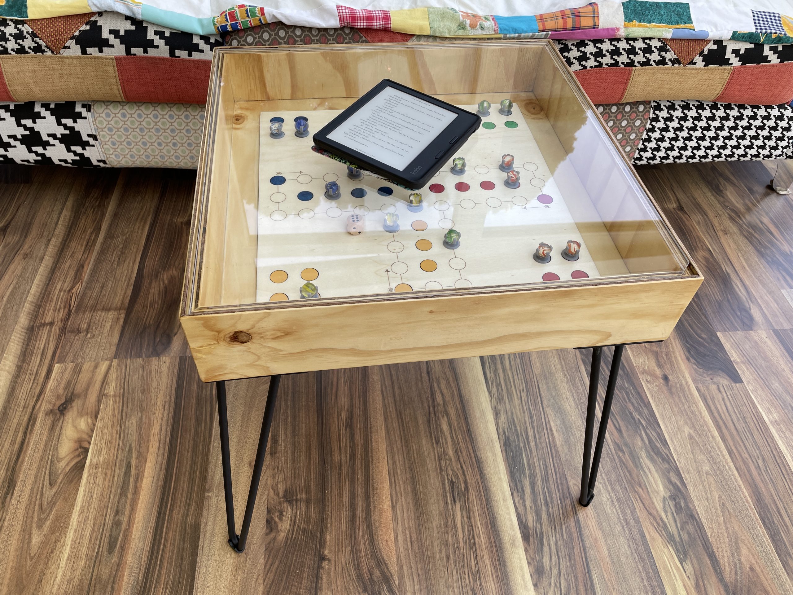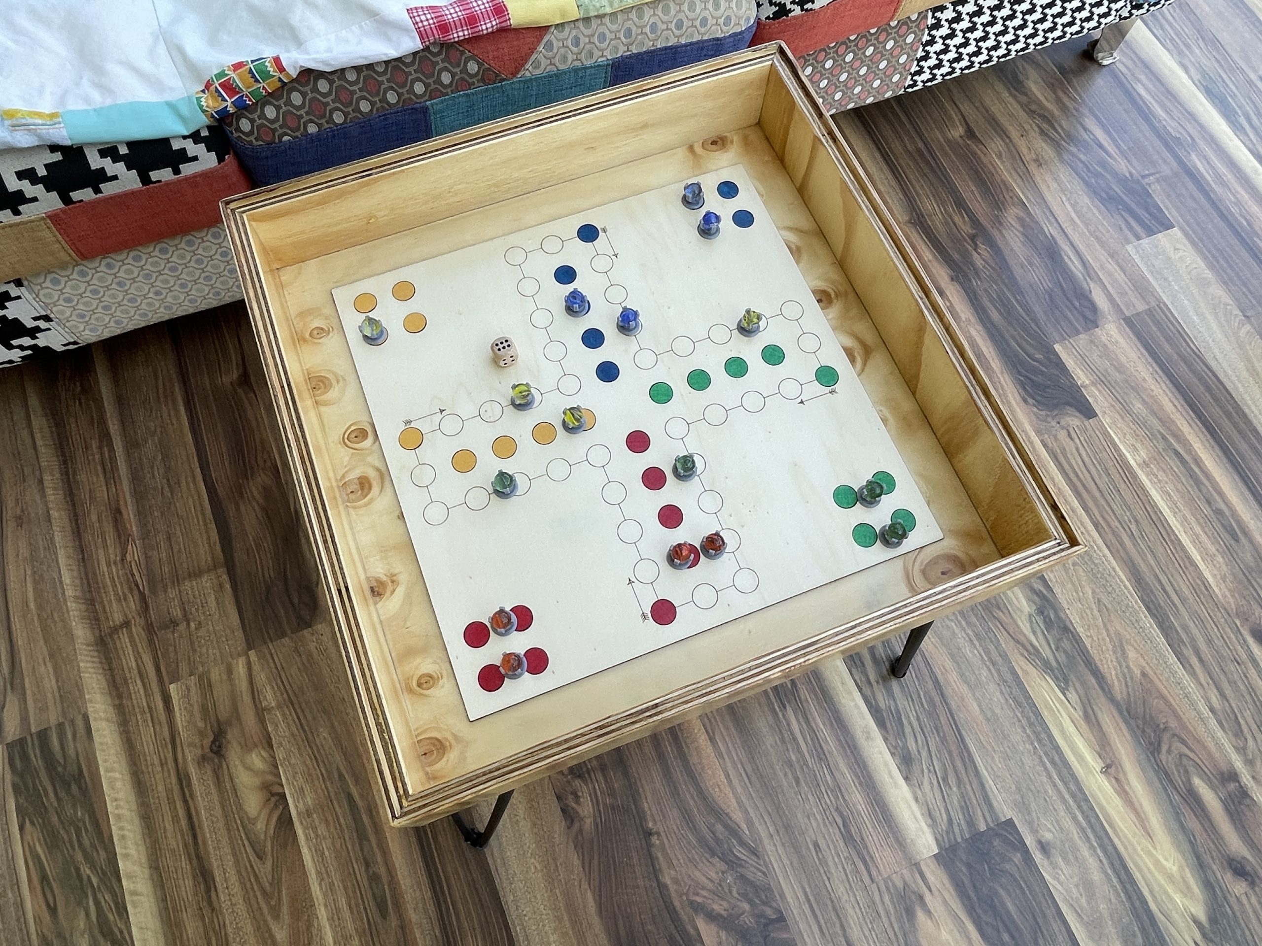 Ta unikatna klubska mizica združuje tradicionalno družabno igro Človek ne jezi se in sodoben dizajn, zaradi česar je popolna za sproščene trenutke s prijatelji in družino. Narejena je iz vezane plošče, pleksi stekla in ima elegantne kovinske noge. Priložene so unikatne ročno izdelne figurice.